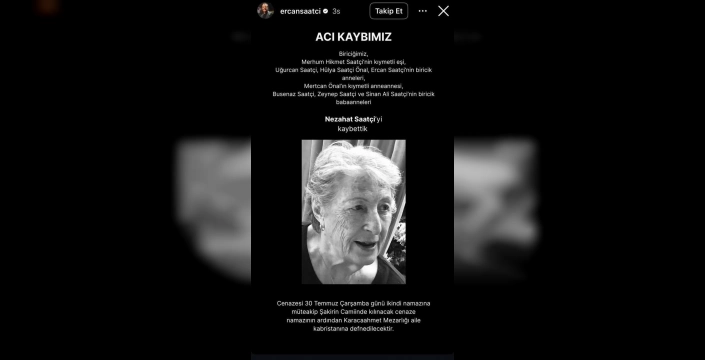 Nezahat Saatçi'nin cenazesinin, 30 Temmuz'da (Bugün) öğlen namazına müteakip kılınacak cenaze namazı ardından Karacaahmet Mezarlığı'na defnedileceği açıklandı. Ercan Saatçi'nin müzik kariyeri ve eğitim hayatı ile ilgili bilgiler de kamuoyuyla paylaşıldı. Ercan Saatçi, 13 Mart 1968 tarihinde İstanbul'da doğdu. İlköğretim yıllarında mandolin, akordeon ve Türk halk oyunları dersleri aldı. Haydarpaşa Lisesi'nde orta ve lise eğitimini tamamladı. Lise yıllarında Sabri Süha Ansen'den keman dersleri aldı ve okulun müzik grubunu kurarak çeşitli liseler arası müzik yarışmalarına katıldı. 1985 yılında ise Ercan-Yavuz-Vahe adlı bir grup kurarak çeşitli ödüller kazandı.