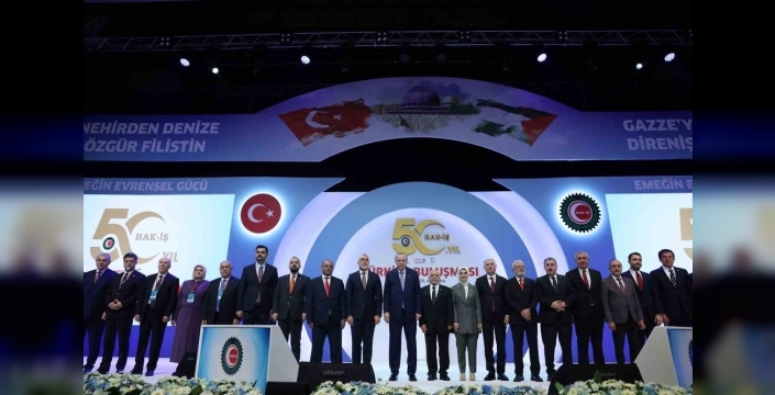 Erdoğan, HAK-İŞ Konfederasyonu'nun 50. yıldönümü dolayısıyla sendikanın emek, demokrasi, özgürlük ve adalet mücadelesini takdir ederek teşekkür etti. 'HAK-İŞ’e ilk günden beri dirayetle sürdürdüğü emek, demokrasi, özgürlük ve adalet mücadelesi için öncelikle teşekkür ediyorum. 50’nci yılın, Hak-İş camiasıyla birlikte sendikalarımız, emekçilerimiz, çalışma hayatımız, ülkemiz ve milletimiz için hayırlı olmasını diliyorum.' ifadelerini kullanan Erdoğan, Türkiye'nin gelişiminde işçilerin katkısını belirterek, 'Şimdiye kadar olduğu gibi, Türkiye Yüzyılında da şeref hakkı, el emeğiyle, göz nuruyla, alın teriyle helal rızkını kazanan siz emekçilerinizin olacaktır. Hükümet olarak bunun için canla, başla çalışmaya devam edeceğiz.' diye ekledi. Cumhurbaşkanı Erdoğan, işçi ve işveren ilişkilerine 'hak temelli' bir bakış açısıyla yaklaşmanın önemini anlattı. 'Bizim medeniyetimizde işçinin, işveren üzerinde hakkı olduğu gibi, işverenin de işçi üzerinde hakkı vardır. Çalışma barışının sağlanması ancak bu şekilde mümkün olacaktır.' dedi ve iş kazalarına dikkat çekerek, 'Evine ekmek götürmek, çocuklarının iaşesini sağlamak, helalinden rızkını kazanmak için ter döken kardeşlerimizin, hepimizi derinden yaralayan bu tür facialarda can vermemesi için hep birlikte daha fazla gayret göstermeliyiz.' şeklinde konuştu. Konuşmasında, hükümetin çalışma hayatına getirdiği yenilikleri, örneğin taşeron işçilerin kadroya geçirilmesi ve 1 Mayıs'ın resmi tatil ilan edilmesini hatırlatan Erdoğan, Türkiye'nin ekonomik başarılarını rakamlarla paylaştı: 'Ekonomide 23 senede yıllık ortalama yüzde 5,4 oranında büyüme kaydettik. 2002’de milli gelirimiz 238 milyar dolardı, biz bunu 2024 yılında 1,5 trilyon dolar sınırına getirdik.' Programa Aile ve Sosyal Hizmetler Bakanı Mahinur Özdemir Göktaş, Çalışma ve Sosyal Güvenlik Bakanı Vedat Işıkhan, HAK-İŞ Genel Başkanı Mahmut Arslan ve çok sayıda sendika üyesi katıldı.