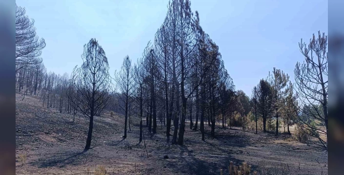 Yangının tahrip ettiği ormanlık alanda yüzlerce ağacın yanmış hali, içler acısı bir manzara oluşturuyor. Söndürme çalışmaları devam ederken, yangının neden çıktığı ve ne kadar alana yayıldığı konusunda incelemeler yürütülüyor.