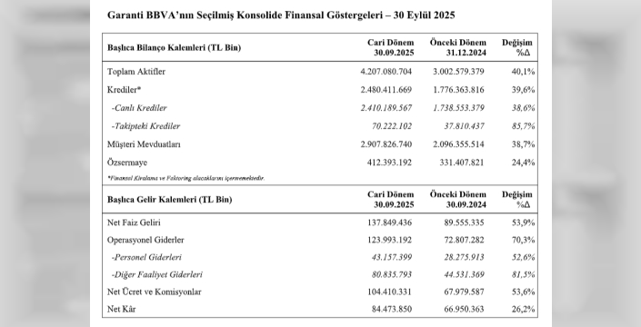 Garanti BBVA, 2025'in ilk dokuz ayında dikkat çekici finansal sonuçlar elde etti. Bankanın aktif büyüklüğü 4 trilyon 207 milyar 80 milyon 704 bin TL'ye ulaşırken, ekonomiye sağlanan nakdi ve gayri nakdi krediler 3 trilyon 227 milyar 622 milyon 852 bin TL seviyesinde gerçekleşti. Müşteri mevduatlarının fonlama kaynaklarının yüzde 69,1'ini oluşturması, bankanın sürdürülebilir büyüme performansını gözler önüne serdi.