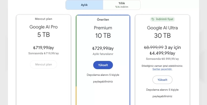 Google yöneticilerından Shimrit Ben-Yair'in X platformu üzerinden duyurduğu resmi açıklamaya göre, standart olarak 2 TB bulut depolama sunan Google AI Pro planı, artık 5 TB kapasiteye sahip olacak. Bu devasa kapasite artışı, Türkiye'de aylık 719,99 TL olan mevcut abonelik ücretine yansımayacak. Bu stratejik hamle sayesinde kullanıcılar, sadece daha fazla depolama alanı için piyasada aylık yaklaşık 9.000 TL'ye satılan AI Ultra paketine geçiş yapma zorunluluğundan kurtuluyor.