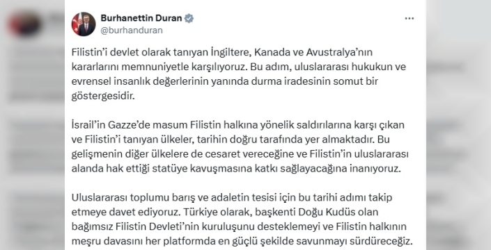 İletişim Başkanı Burhanettin Duran, İngiltere, Kanada ve Avustralya’nın Filistin’i devlet olarak tanıma kararını olumlu karşıladıklarını açıkladı.