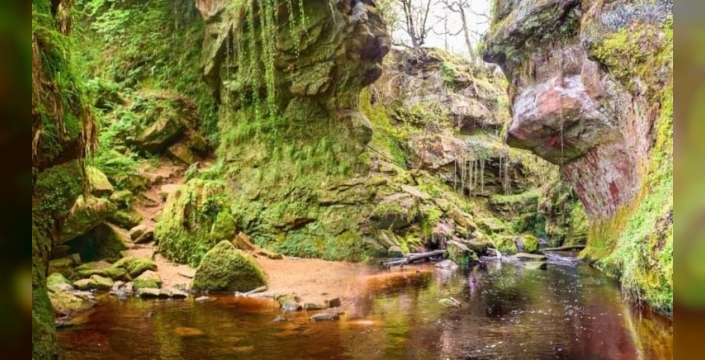 Bıçakla kesilmiş gibi dik yükselen kayalar, üzerini kaplayan parlak yeşil yosunlar ve ortasından akan kan kırmızısı bir nehir... Burası, İskoçya'nın en büyüleyici doğa harikası olan Finnich Glen, halk arasında bilinen adıyla: "Şeytanın Kürsüsü."