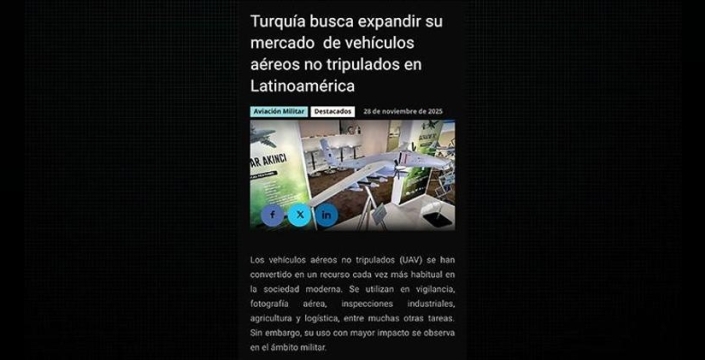 İspanyol havacılık ve savunma dergisi Aero Naves, Türkiye'nin insansız hava araçlarındaki olağanüstü yükselişini analiz etti. Raporda, Türk SİHA'larının küresel pazarda tarihi bir başarı elde ettiği vurgulanırken, "Türkiye'nin yeni hedefi, gözetim ve iç güvenlik ihtiyacı yüksek olan Latin Amerika pazarı. Yakında Türkler burayı da fethedecek" ifadelerine yer verildi.
