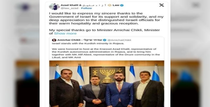 Azad Halil, Chikli'nin paylaşımına yanıt olarak X hesabından yaptığı açıklamada, İsrail'deki desteklerinden dolayı teşekkürlerini iletti. Halil ayrıca, terör örgütü YPG'nin kontrolündeki bölgelerdeki sözde özerk yönetimin temsilcisi olarak, Kürt halkı ile Yahudi halkının dost olduğunu iddia etti.
