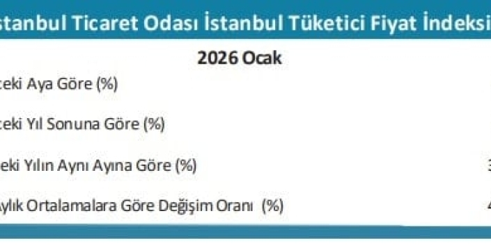 Son dakika… İstanbul Ticaret Odası, 2026 Ocak ayı enflasyon rakamlarını duyurdu. Buna göre, İstanbul'un enflasyonu ocak ayında aylık bazda yüzde 4,56 artarken, yıllık bazda yüzde 36,15 oldu.
