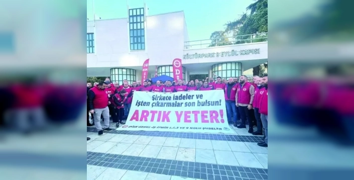 CHP'li İzmir Büyükşehir Belediyesi'nde işçilerin eyleminin ikinci günü geride kaldı. Belediye iştirakleri İZELMAN, İZENERJİ ve İZFAŞ'tan atılan ve iade edilmelerine rağmen işe başlatılmayan işçiler, dün eylemlerine devam etti. Grup içinde temmuz ayında ücretsiz izne çıkarılıp bir daha işbaşı yaptırılmayan işçiler de yer aldı. Kültürpark 9 Eylül Kapısı önünde bir araya gelen DİSK/Genel-İş üyesi işçiler ve sendika temsilcileri, "Şirkete iadeler ve işten çıkarmalar son bulsun. Artık yeter" yazılı pankart açıp sloganlar attı.