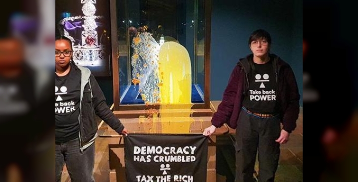 Take Back Power adlı grubun eylemcileri, ülkedeki aşırı zenginlerden daha fazla vergi alınması ve 'Halk Kamarası' adıyla bir halk meclisi kurulması taleplerini dile getirdi. Tacın cam muhafazasına, elmalı kruvasan ve muhallebi sürerek, önünde "Demokrasi parçalanıyor, zenginleri vergilendir" yazılı bir pankart açtılar.