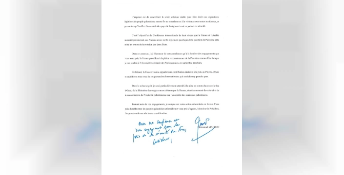 Mektupta, Fransa'nın yalnızca diplomatik bir tanımayla yetinmeyeceğini, aynı zamanda bölgesel barışa katkı sunma konusunda da kararlı olduğunu belirten Macron, Gazze'de kalıcı bir ateşkesin sağlanması, Hamas tarafından alıkonulan rehinelerin serbest bırakılması ve Filistin Yönetimi'nin Gazze'de de tüm sorumluluğu yeniden üstlenebilmesini öncelikleri arasında saydı. Macron, mektubu, Filistin ve İsrail halkları arasında kalıcı ve adil bir barış için gösterilen kararlılığa olan saygısını ifade ederek tamamladı.