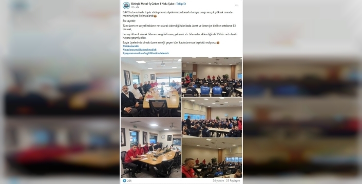Sendikanın sosyal medya hesabından yapılan açıklamada, sözleşmenin üyelerin onayı ve yüksek memnuniyetiyle imzalandığı belirtildi. CAVO Otomotiv'deki anlaşma ile tüm ücret ve sosyal hakların net ödendiği fabrikada, ücret ve ikramiye birlikte ortalama 83 bin net olarak belirlendi. Buna her ay düzenli ödenen vergi istisnası ve yakacak yardımı gibi ödemeler eklendiğinde, işçilerin aylık net geliri 95 bin liraya ulaştı.