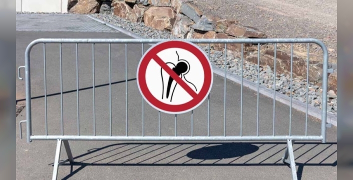 Tabeladaki şekil, şematik bir yapay kalça implantını temsil ediyor ve altında 'Metal implantı olan kişilerin girişi yasaktır' uyarısı yer alıyor. Bu basit bir metal parçasının neden tehlikeli olduğu sorusunun cevabı, bölgedeki görünmez elektromanyetik alanlarda saklı. Fabrikaların özel bölümleri, MR odaları veya askeri alanlar gibi güçlü elektromanyetik alanların olduğu yerlerde bu tabelalar asılıyor.