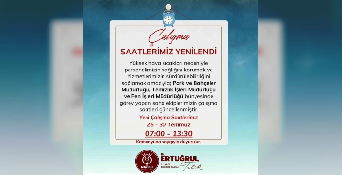 Belediyenin duyurusunda, 'Yüksek hava sıcaklıkları nedeniyle personelimizin sağlığını korumak ve hizmetlerimizin sürdürülebilirliğini sağlamak amacıyla; yeni çalışma saatlerimiz 25 - 30 Temmuz 2025 tarihleri arasında 07.00-13.30 şeklinde olacaktır' ifadeleri kullanıldı.