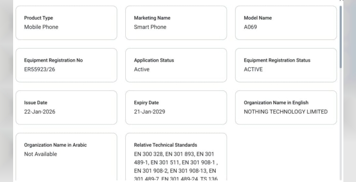 Nothing'in yeni orta segment modeli, BAE'nin Telekomünikasyon ve Dijital Devlet Düzenleme Kurumu veritabanında A069 model numarasıyla listelendi. 22 Ocak 2026 tarihinde verilen bu sertifika, cihazın resmi satışa sunulması için gerekli yasal onaylardan birini aldığını gösteriyor. Sertifika belgesinde cihazdan basitçe 'akıllı telefon' olarak bahsedilse de, bu model numarasının daha önce IMEI veritabanında da görülmesi, A069'un Nothing Phone (4a) olduğuna dair beklentileri güçlendiriyor. Bu tür sertifikasyon süreçleri genellikle lansmandan birkaç ay önce tamamlanır, bu nedenle teknoloji analistleri Nothing Phone (4a)'nın 2026 yılının ilk çeyreğinde, muhtemelen Mart ayına kadar tanıtılacağını öngörüyor.