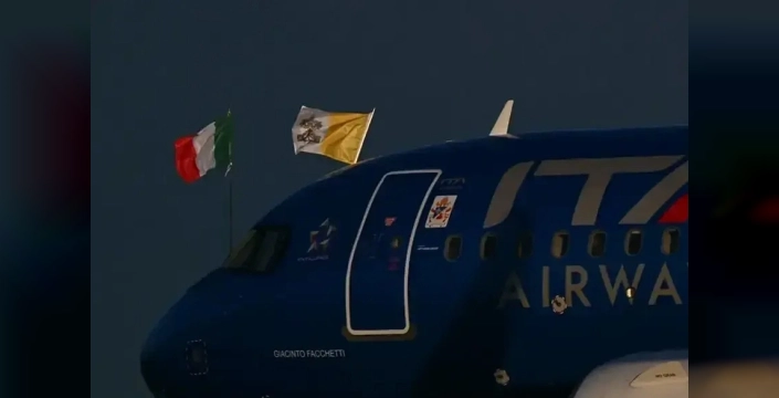 Papa Leo, Ankara'ya İtalyan Havayolları'na ait Giancinto Facchetti isimli uçakla geldi. İtalyan Havayolları'na ait uçağın kapısının solunda Papa Leo'nun resmi arması yer aldı. Papa XIV. Leo'nun sloganı IN ILLO UNO UNUM ("Bir'de, biz biriz") armanın en altında yer aldı. Resmi armada, Leo'nun iki dönem boyunca Başrahip olarak görev yaptığı Aziz Augustinus Tarikatı'nın amblemi olan, okla delinmiş ve alevlenmiş bir kalp yer aldı. İtalyan Havayolları'nın Papa'nın hizmetine sunduğu uçağa ismi verilen Facchetti, efsaneleşmiş bir futbolcuydu ve ilk milli maçına 1963 yılında Türkiye'ye karşı çıkmıştı.