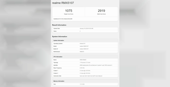 Geekbench veri tabanında RMX5107 model numarasıyla listelenen telefon, tek çekirdekli işlemde 1.075 puan, çok çekirdekli işlemde ise 2.919 puan almayı başardı. Bu skorlar, Realme P4 Power'ın orta segmentte güçlü bir performans sunacağını gösteriyor. Cihazın içindeki MediaTek Dimensity 7400 yonga seti, 2.00 GHz hızında çalışan dört çekirdek ve 2.60 GHz hızında çalışan dört performans çekirdeğinden oluşuyor.