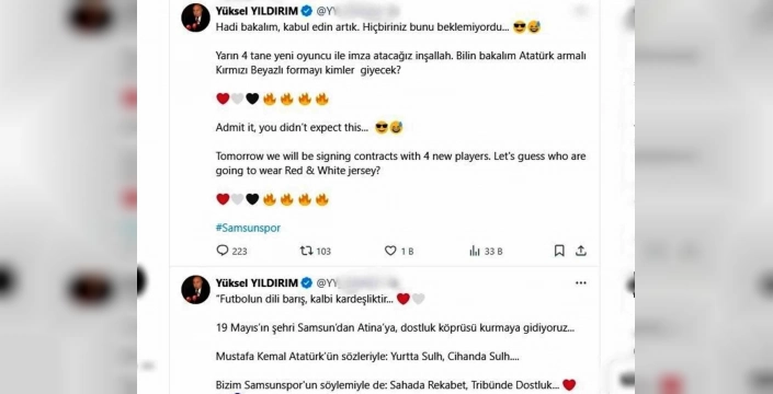 Samsunspor Başkanı Yüksel Yıldırım, UEFA Avrupa Ligi play-off turu öncesinde kulübe 4 yeni oyuncu katılacağını duyurdu. Yıldırım, sosyal medya hesabından yaptığı açıklamada, beklenmedik bu gelişmeyi taraftarlarla paylaştı. Başkan, yeni oyuncuların kimler olacağını merak konusu bırakarak heyecanı artırdı.