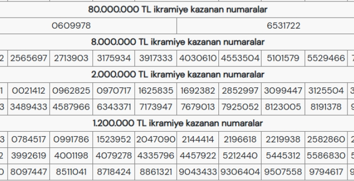 Büyük ikramiye olan 800 milyon Türk Lirası, ilk çekilişte sahibini bulamadı. İkinci çekilişte ise 3, 0, 3, 1, 3, 8, 5 rakamlarına sahip üç ayrı çeyrek bilete isabet etti. Bu şanslı biletler, İstanbul'un Esenyurt ve Ümraniye ilçelerinden ve Konya'nın Akşehir ilçesinden alınmış. İkramiye, üç talihli arasında eşit olarak bölünecek.