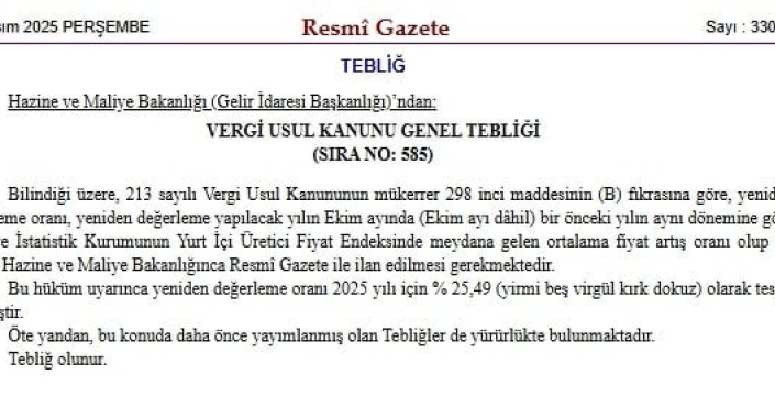 Resmi Gazete'de yayımlanan son dakika kararıyla, 2026 yılında uygulanacak Yeniden Değerleme Oranı yüzde 25,49 olarak açıklandı. Bu oran, ekim ayı enflasyon verilerine dayanarak belirlendi ve herhangi bir değişikliğe uğramadan yürürlüğe girdi.