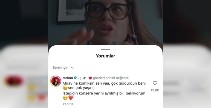 Sanatçının da dikkatinden kaçmayan bu video üzerine Tarkan, Akovalıgil'in paylaşımına yorum yaparak jest yaptı. Tarkan, "Miray ne komiksin sen yaa, çok güldürdün beni. Sen çok yaşa. İstediğin konsere yerin ayrılmış bil, bekliyorum." ifadeleriyle Akovalıgil'e davetini iletti.