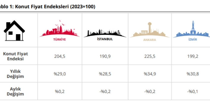Konut fiyatlarının kalite etkisinden arındırılmış değişimlerini takip etmek amacıyla hesaplanan Konut Fiyat Endeksi (KFE) (2023=100) 2025 yılı Aralık ayında bir önceki aya göre yüzde 0,2 artışla 204,5 seviyesine ulaşmıştır. Bu veriler, konut piyasasındaki gelişmeleri de gözler önüne sermektedir.