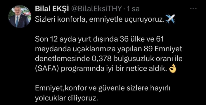THY Genel Müdürü Bilal Ekşi, sosyal medya hesabından yaptığı açıklamada, son 12 ayda yurt dışında 36 ülke ve 61 meydanda uçaklara yapılan 89 emniyet denetlemesinde elde edilen 0,378 bulgusuzluk oranını paylaştı. Ekşi, güvenlik, konfor ve güvenilir uçuşlar sağlamaya devam ettiklerinin altını çizdi.