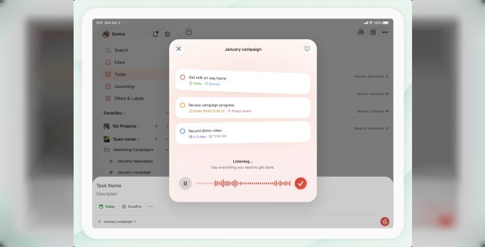 Ramble, karmaşık ve düzensiz konuşmalarınızı alıp düzenli görevlere dönüştürebiliyor. Uygulama, ayrıca proje son tarihleri, öncelikler, süreler ve atanmış kişiler gibi bahsettiğiniz diğer detayları da yakalayabiliyor. Fikir, insanların hareket halindeyken akıllarına gelen görevleri not almak için telefonlarını çıkarmanın zorluğudur. Todoist Ramble ile telefonunuzu çıkarmanız gerekiyor, ancak herhangi bir şey yazmanıza gerek kalmıyor. Ramble simgesine dokunarak konuşmaya başlayabiliyorsunuz ve uygulama, konuştuğunuz anlarda görevin bilgilerini gerçek zamanlı olarak güncelleyebiliyor.