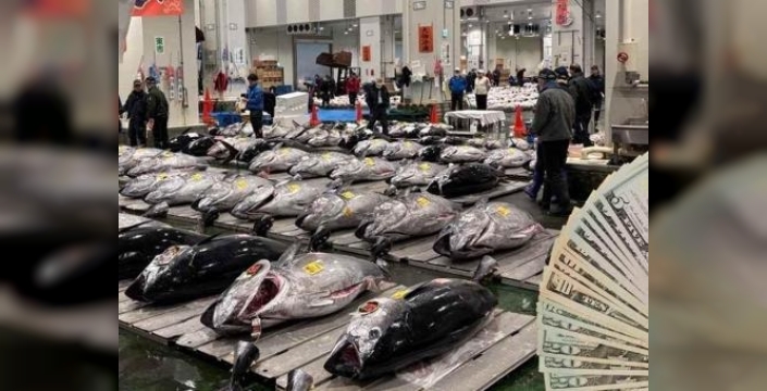 Japonya'nın başkenti Tokyo'daki Toyosu Balık Hali, yeni yılın geleneksel ilk balık mezatına ev sahipliği yaptı. Bu yılki mezatta, Aomori eyaletinin Oma kasabası açıklarında yakalanan 243 kilogramlık mavi yüzgeçli orkinos, 510,3 milyon yen (yaklaşık 3,2 milyon dolar) rekor fiyata alıcı buldu. En yüksek teklifi veren 'Kiyomura Corp.' adlı firma, bu dev balığın kilogramı için 2,1 milyon yen (yaklaşık 13 bin dolar) ödedi.