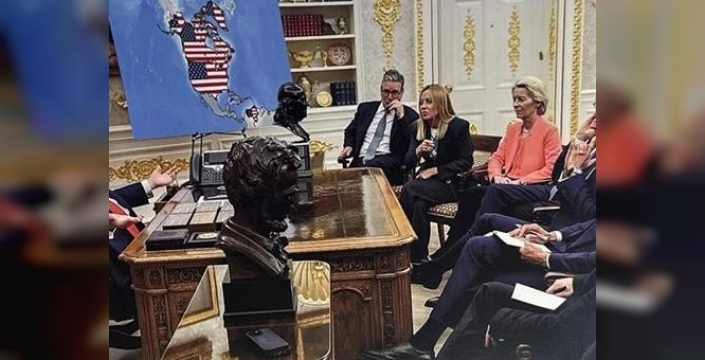 ABD eski Başkanı Donald Trump, sosyal medya platformu Truth Social'dan yaptığı yeni bir paylaşımla yeniden gündem oldu. Paylaşımda, Trump ve Avrupalı liderlerin bir toplantı yaptığı bir fotoğraf yer alıyor ve bu fotoğraftaki detay büyük tartışma yarattı.