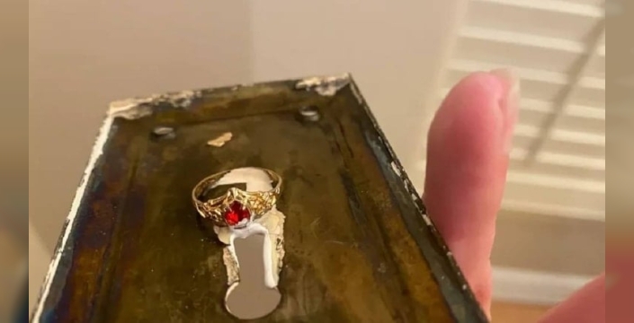 Kapı pervazlarını temizlerken, çift inanılmaz bir şey buldu: Pervazın içine yapıştırılmış bir yüzük. Boya katmanlarının yoğunluğu göz önüne alındığında, yüzüğün neredeyse bir asırdır orada olabileceği tahmin ediliyor. İlk bakışta altından yapılmış gibi görünen metal ve kırmızı renkteki taş, değerli bir takı olabileceği izlenimini veriyordu.